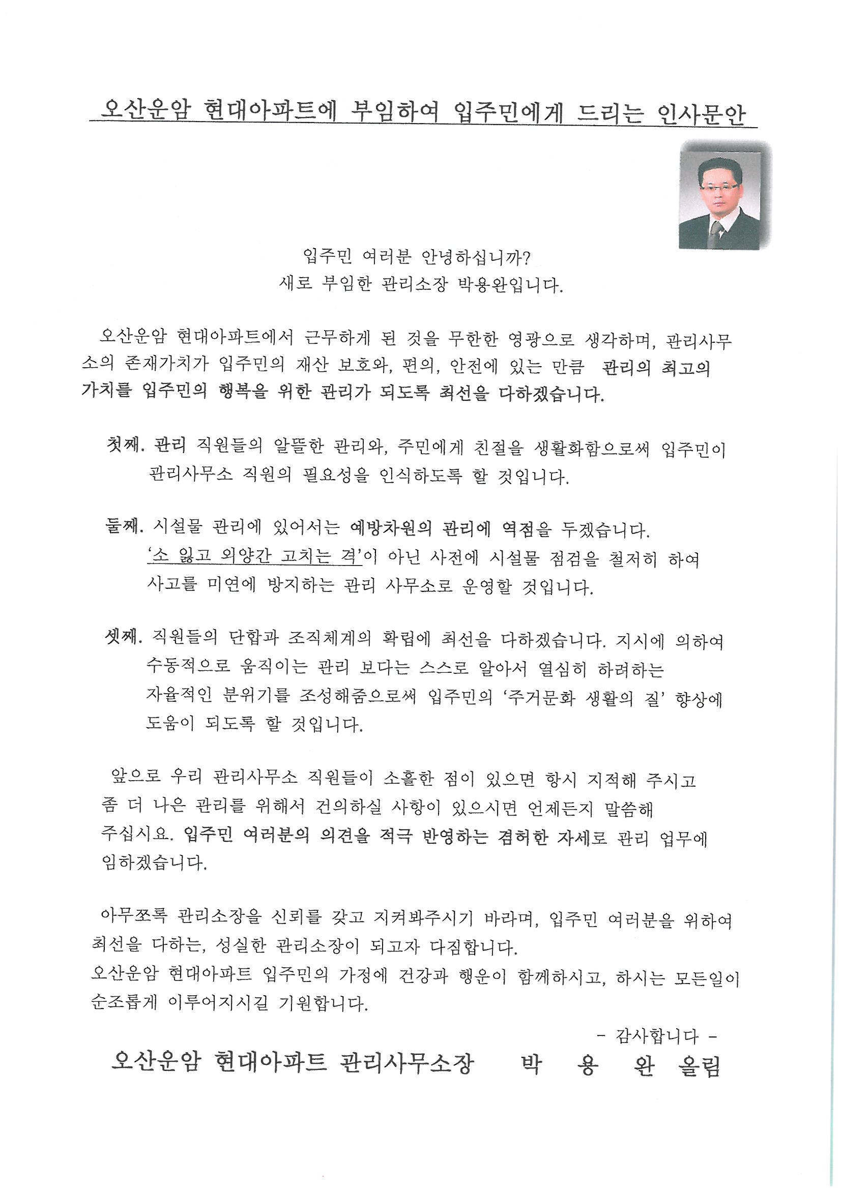 ¿î¾ÏÇö´ë¾ÆÆÄÆ®¿¡¼ ±Ù¹«ÇÏ°Ô µÈ °ÍÀ» ¹«ÇÑÇÑ ¿µ±¤À¸·Î »ý°¢Çϸç, °ü¸®»ç¹«¼ÒÀÇ Á¸Àç°¡Ä¡°¡ ÀÔÁÖ¹ÎÀÇ Àç»ê º¸È£¿Í, ÆíÀÇ, ¾ÈÀü¿¡ ÀÖ´Â ¸¸Å °ü¸®ÀÇ ÃÖ°íÀÇ °¡Ä¡¸¦ ÀÔÁÖ¹ÎÀÇ ÇູÀ» À§ÇÑ °ü¸®°¡ µÇµµ·Ï ÃÖ¼±À» ´ÙÇϰڽÀ´Ï´Ù.